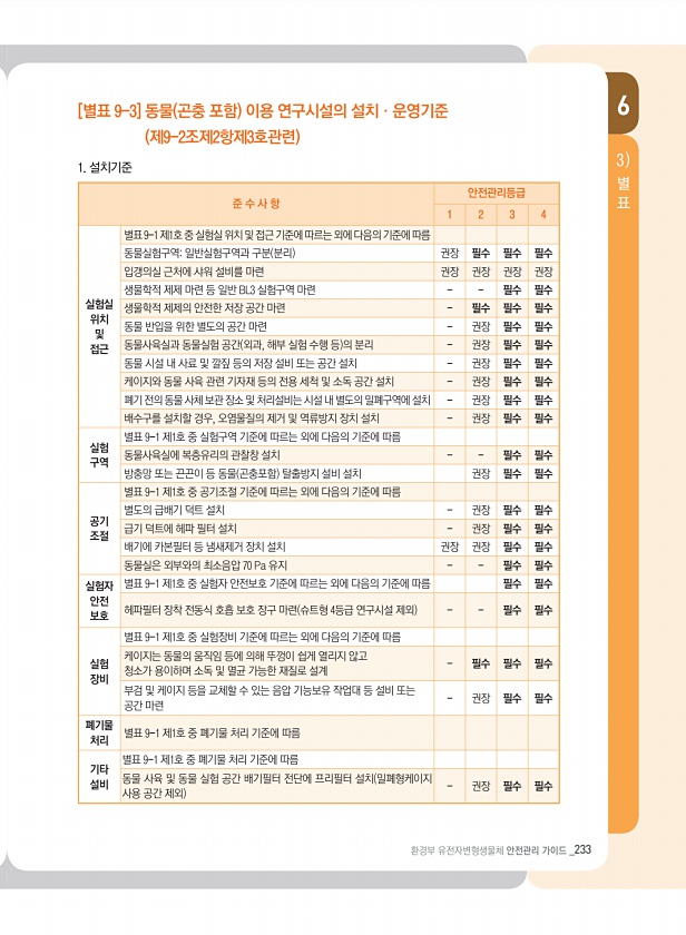 환경부 유전자변형생물체 안전관리 가이드 _233 6 별 표 3 [별표 9-3] 동물 곤충 포함 이용 연구시설의 설치·운영기준 제9-2조제2항제3호관련 1. 설치기준 준 수 사 항 안전관리등급 1 2 3 4 실험실 위치 및 접근 별표 9-1 제1호 중 실험실 위치 및 접근 기준에 따르는 외에 다음의 기준에 따름 동물실험구역일반실험구역과 구분 분리 권장 필수 필수 필수 입갱의실 근처에 샤워 설비를 마련 권장 권장 권장 권장 생물학적 제제 마련 등 일반 BL3 실험구역 마련 필수 필수 생물학적 제제의 안전한 저장 공간 마련 필수 필수 필수 동물 반입을 위한 별도의 공간 마련 권장 필수 필수 동물사육실과 동물실험 공간 외과, 해부 실험 수행 등 의 분리 권장 필수 필수 동물 시설 내 사료 및 깔짚 등의 저장 설비 ...
