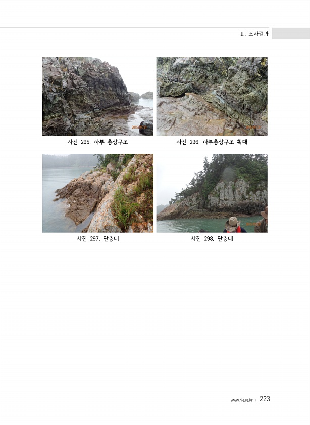 Ⅱ. 조사결과 www.nie.re.kr ? 223 사진 295. 하부 층상구조 사진 296. 하부층상구조 확대 사진 297. 단층대 사진 298.단층대