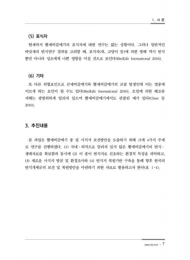Ⅰ. 서 론 www.nie.re.kr ? 7 5 포식자 현재까지 뿔제비갈매기의 포식자에 대한 연구는 없는 상황이다. 그러나 일반적인 바닷새의 번식연구 결과를 고려할 때, 포식자 쥐, 고양이 등 에 의한 방해 역시 번식 뿐만 아니라 성조에게 나쁜 영향을 미칠 것으로 보인다 BirdLife Inernational 2016 6 기타 또 다른 위협요인으로 큰제비갈매기와 뿔제비갈매기의 교잡 발생인데 이는 멸종에 이르게 하는 요인이 될 수도 있다 BirdLife Inernational 2016 오일에 의한 해조류 피해는 광범위하게 알려져 있으며 뿔제비갈매기에서도 관찰된 예가 있다 Chan 등 2010 3. 추진내용 본 과업은 뿔제비갈매기 종 및 서식지 보전방안을 도출하기 위해 크게 4가지 주제 로 연구를 진행하였다. ...