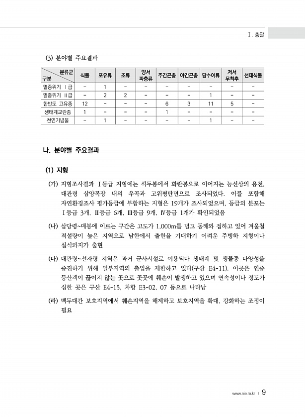 Ⅰ. 총괄 www.nie.re.kr ? 9 3 분야별 주요결과 분류군 구분 식물 포유류 조류 파충류 양서 주간곤충 야간곤충 담수어류 무척추 저서 선태식물 멸종위기 Ⅰ급 1 멸종위기 Ⅱ급 2 2 1 한반도 고유종 12 6 3 11 5 생태계교란종 1 1 천연기념물 1 1 나. 분야별 주요결과 1 지형 가 지형조사결과 Ⅰ등급 지형에는 석두봉에서 화란봉으로 이어지는 능선상의 용천, 대관령 삼양목장 내의 우곡과 고위평탄면으로 조사되었다. 이를 포함해 자연환경조사 평가등급에 부합하는 지형은 19개가 조사되었으며, 등급의 분포는 Ⅰ등급 3개, Ⅱ등급 6개, Ⅲ등급 9개, Ⅳ등급 1개가 확인되었음 나 삽당령매봉에 이르는 구간은 고도가 1,000m를 넘고 동해와 접하고 있어 겨울철 적설량이 높은 지역으로 남한에서 출현을 ...