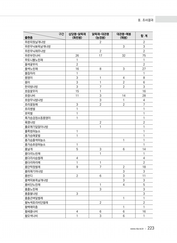 Ⅱ. 조사결과 www.nie.re.kr ? 223 구간 출현종 삽당령닭목재 화란봉 닭목재대관령 능경봉 대관령매봉 매봉 합 계 푸른띠뒷날개나방 2 2 푸른무늬뾰족날개나방 3 3 푸른무늬재주나방 2 2 푸른부전나비 26 17 32 75 푸토니뿔노린재 1 1 풀색꽃무지 2 2 풀색노린재 16 8 3 27 풀잠자리 1 1 풍뎅이 3 1 4 8 풍이 3 1 2 6 한국밤나방 3 7 2 3 호랑꽃무지 15 1 16 호랑나비 11 3 14 28 호랑무늬밤나방 3 1 4 호리꽃등에 3 2 2 7 호리병벌 1 1 호박벌 1 1 혹가슴검정소똥풍뎅이 1 1 혹명나방 2 2 홀로애기잎말이나방 1 1 홀쭉범하늘소 1 1 홍가슴애꽃벌 1 1 홍가슴풀색하늘소 1 1 홍가슴호랑하늘소 1 1 홍날개 5 3 6 14 홍다리노린재 1 1 홍...