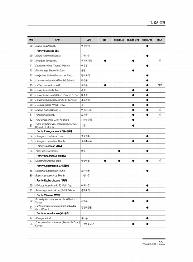 III. 조사결과 www.nie.re.kr ?221 번호 학명 국명 해빈 배후습지 배후농경지 배후삼림 비고 68 Rubus parvifolius L. 멍석딸기 ● Family Fabaceae 콩과 69 Albizia julibrissin Durazz. 자귀나무 ● 70 Amorpha fruticosa L. 족제비싸리 ● ● 외 71 Dunbaria villosa Thunb. Makino 여우팥 ● 72 Glycine soja Siebold & Zucc. 돌콩 ● 73 Indigofera kirilowii Maxim. ex Palib. 땅비싸리 ● 74 Kummerowia striata Thunb. Schindl. 매듭풀 ● 75 Lathyrus japonicus Willd. 갯완두 ● ● 사구 76 Lesp...
