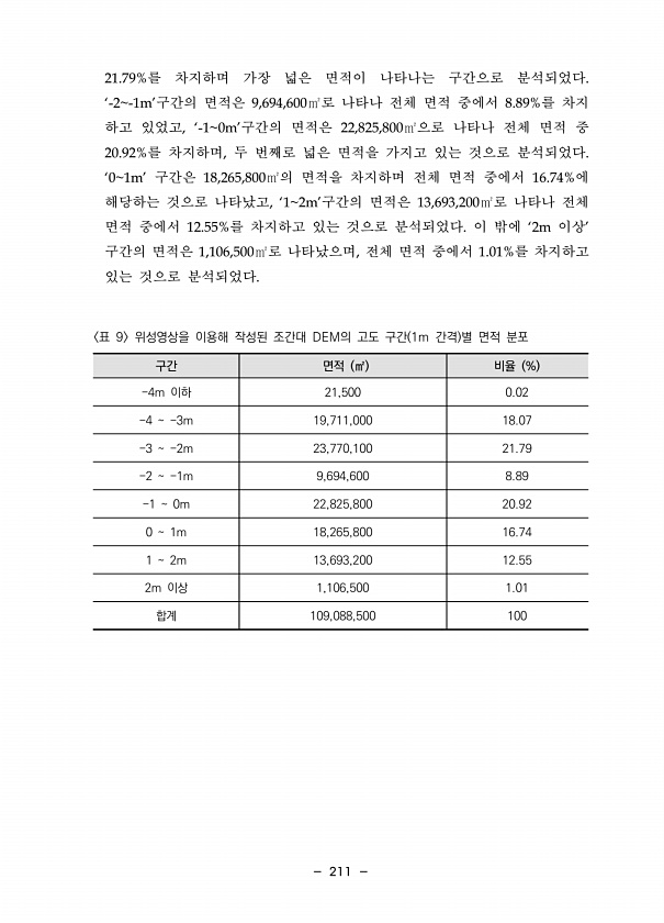 211 21.79%를 차지하며 가장 넓은 면적이 나타나는 구간으로 분석되었다. ‘-2-1m’구간의 면적은 9,694,600㎡로 나타나 전체 면적 중에서 8.89%를 차지 하고 있었고, ‘-10m’구간의 면적은 22,825,800㎡으로 나타나 전체 면적 중 20.92%를 차지하며, 두 번째로 넓은 면적을 가지고 있는 것으로 분석되었다. ‘01m’ 구간은 18,265,800㎡의 면적을 차지하며 전체 면적 중에서 16.74%에 해당하는 것으로 나타났고, ‘12m’구간의 면적은 13,693,200㎡로 나타나 전체 면적 중에서 12.55%를 차지하고 있는 것으로 분석되었다. 이 밖에 ‘2m 이상’ 구간의 면적은 1,106,500㎡로 나타났으며, 전체 면적 중에서 1.01%를 차지하고 있는 것으로 분석되었다. 구간 면...