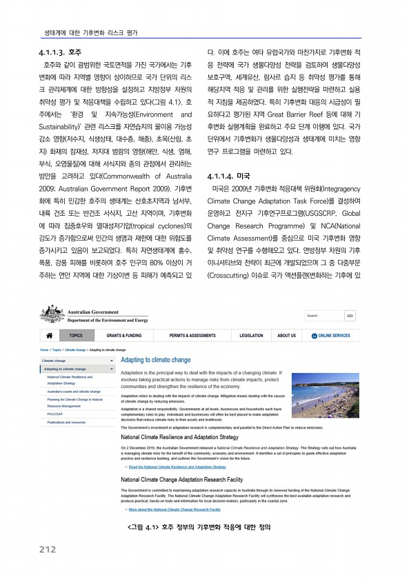 생태계에 대한 기후변화 리스크 평가 212 4.1.1.3. 호주 호주와 같이 광범위한 국토면적을 가진 국가에서는 기후 변화에 따라 지역별 영향이 상이하므로 국가 단위의 리스 크 관리체계에 대한 방향성을 설정하고 지방정부 차원의 취약성 평가 및 적응대책을 수립하고 있다 그림 4.1 호 주에서는 ‘환경 및 지속가능성 Environment and Sustainability ’ 관련 리스크를 자연습지의 물이용 가능성 감소 영향 저수지, 식생상태, 대수층, 해충 , 초목 산림, 초 지 화재의 잠재성, 저지대 범람의 영향 해안, 식생, 염해, 부식, 오염물질 에 대해 서식지와 종의 관점에서 관리하는 방안을 고려하고 있다 Commonwealth of Australia 2009; Australian Government R...