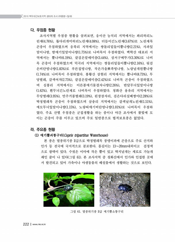 2016 백두대간보호지역 생태계 조사 추풍령밀재 222Ⅰwww.nie.re.kr 다. 우점종 현황 조사지역별 우점종 현황을 살펴보면, 웅이산 능치리 지역에서는 꽈리허리노 린재 4.76% , 톱다리개미허리노린재 4.08% , 더듬이긴노린재 3.67% 로 노린재목 곤충이 우점하였으며 웅북리 지역에서는 쌍돌리밑들이뿔나방 2.21% , 사과잎 말이나방, 밤애기잎말이나방 1.75% 로 나비목이 우점하였다. 백학산 대포리 지 역에서는 뿔나비 6.19% , 끝검은말매미충 3.44% , 섬서구메뚜기 3.30% 로 나비 목 곤충이 우점하였으며 덕곡리 지역에서는 쌍돌리밑들이뿔나방 2.16% , 뒷검 은비단명나방 1.83% 로 푸른집명나방, 작은가을뾰족명나방, 노랑날개원뿔나방 1.74% 로 나비목이 우점하였다. 봉황산 상현리 ...