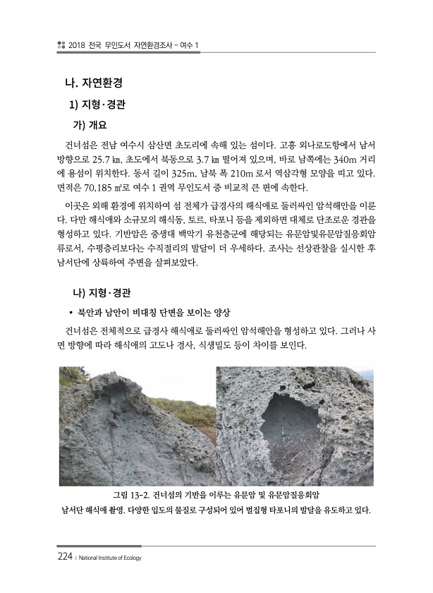 2018 전국 무인도서 자연환경조사 여수 1 224 ? National Institute of Ecology 1 · 건너섬은 전남 여수시 삼산면 초도리에 속해 있는 섬이다. 고흥 외나로도항에서 남서 방향으로 25.7 ㎞, 초도에서 북동으로 3.7 ㎞ 떨어져 있으며, 바로 남쪽에는 340m 거리 에 용섬이 위치한다. 동서 길이 325m, 남북 폭 210m 로서 역삼각형 모양을 띠고 있다. 면적은 70,185 ㎡로 여수 1 권역 무인도서 중 비교적 큰 편에 속한다. 이곳은 외해 환경에 위치하여 섬 전체가 급경사의 해식애로 둘러싸인 암석해안을 이룬 다. 다만 해식애와 소규모의 해식동, 토르, 타포니 등을 제외하면 대체로 단조로운 경관을 형성하고 있다. 기반암은 중생대 백악기 유천층군에 해당되는 유문암및유문암질응회...