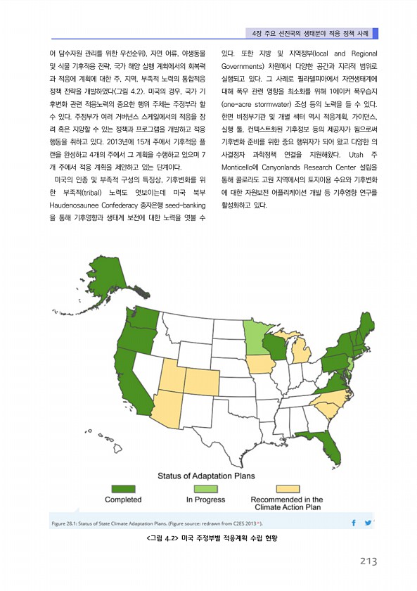 4장 주요 선진국의 생태분야 적응 정책 사례 213 어 담수자원 관리를 위한 우선순위 , 자연 어류, 야생동물 및 식물 기후적응 전략, 국가 해양 실행 계획에서의 회복력 과 적응에 계획에 대한 주, 지역, 부족적 노력의 통합적응 정책 전략을 개발하였다 그림 4.2 미국의 경우, 국가 기 후변화 관련 적응노력의 중요한 행위 주체는 주정부라 할 수 있다. 주정부가 여러 거버넌스 스케일에서의 적응을 장 려 혹은 지양할 수 있는 정책과 프로그램을 개발하고 적응 행동을 취하고 있다. 2013년에 15개 주에서 기후적응 플 랜을 완성하고 4개의 주에서 그 계획을 수행하고 있으며 7 개 주에서 적응 계획을 제안하고 있는 단계이다. 미국의 인종 및 부족적 구성의 특징상, 기후변화를 위 한 부족적 tribal 노력도 엿보이...
