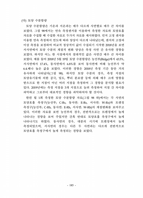 185 다 토양 수분함량 토양 수분함량은 기온과 지온과는 매우 다르게 사면별로 매우 큰 차이를 보였다. 그림 98에서는 연속 측정센서를 이용하여 측정한 자료와 토양호흡 자료를 수집할 때 수집한 자료로 두가지 자료를 제시하였다. 먼저 고정 센서를 이용한 연속 측정에서 연도에 따라 양상이 다르게 나타났는데, 센서의 고장과 이상 측정을 보정하여 비교적 정상적이 값이 수집되기 시작한 2018년을 보면 서사면에서 토양 수분의 계절적 변화 양상은 측정 사면 간 유사한 경향을 보였다. 하지만 어느 한 시점에서의 절대적인 값은 사면간 매우 큰 차이를 보였다. 예를 들어 2018년 5월 19일 토양 수분함량은 능선부 Ridge 에서 43.5%, 서사면에서 17.4%, 동사면에서 6.8%를 보여 동사면에 비해 능선부가 약 6...