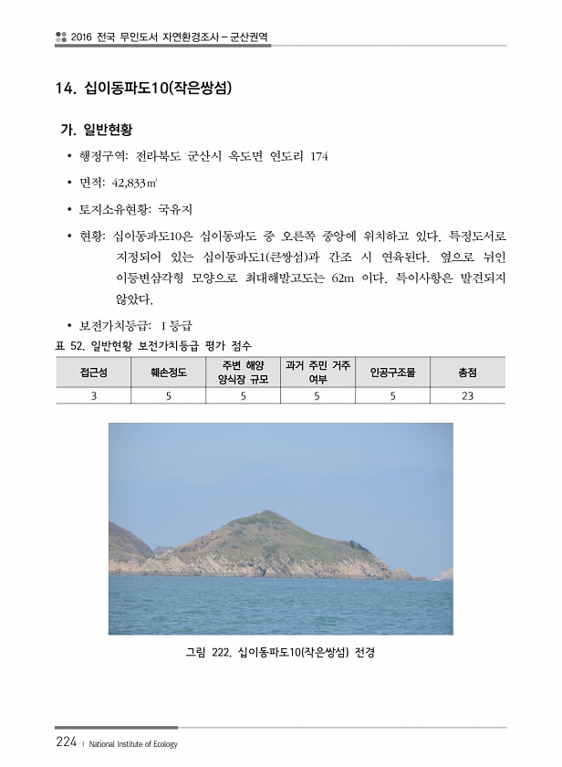 2016 전국 무인도서 자연환경조사 군산권역 224 ? National Institute of Ecology 14. 십이동파도10 작은쌍섬 가. 일반현황 ? 행정구역전라북도 군산시 옥도면 연도리 174 ? 면적42,833㎡ ? 토지소유현황국유지 ? 현황십이동파도10은 십이동파도 중 오른쪽 중앙에 위치하고 있다. 특정도서로 지정되어 있는 십이동파도1 큰쌍섬 과 간조 시 연육된다. 옆으로 뉘인 이등변삼각형 모양으로 최대해발고도는 62m 이다. 특이사항은 발견되지 않았다. ? 보전가치등급Ⅰ등급 표 52. 일반현황 보전가치등급 평가 점수 접근성 훼손정도 주변 해양 양식장 규모 과거 주민 거주 여부 인공구조물 총점 3 5 5 5 5 23 그림 222. 십이동파도10 작은쌍섬전경