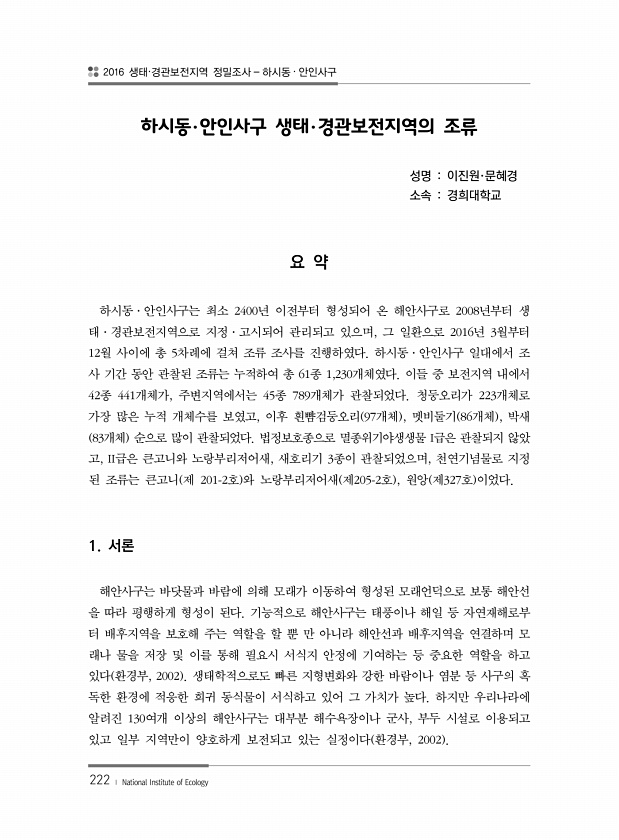 2016 생태·경관보전지역 정밀조사 하시동 · 안인사구 222 ? National Institute of Ecology 하시동·안인사구 생태·경관보전지역의 조류 성명 이진원·문혜경 소속 경희대학교 요 약 하시동·안인사구는 최소 2400년 이전부터 형성되어 온 해안사구로 2008년부터 생 태·경관보전지역으로 지정·고시되어 관리되고 있으며, 그 일환으로 2016년 3월부터 12월 사이에 총 5차례에 걸쳐 조류 조사를 진행하였다. 하시동·안인사구 일대에서 조 사 기간 동안 관찰된 조류는 누적하여 총 61종 1,230개체였다. 이들 중 보전지역 내에서 42종 441개체가, 주변지역에서는 45종 789개체가 관찰되었다. 청둥오리가 223개체로 가장 많은 누적 개체수를 보였고, 이후 흰뺨검둥오리 97개체 , 멧비둘기 ...