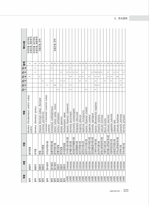 223 목명 과명 국명 학명 St. 1 St. 2 St. 3 St. 4 St. 5 St. 6 합계 특이사항 벌목 꿀벌과 좀뒤영벌 Bombus Pyrobombus ardens subsp. ardens 1 1 국외반출 승인대상, 유용곤충_화분매개 벌목 꿀벌과 호박벌 Bombus Bombus ignitus 1 1 2 국외반출 승인대상, 유용곤충_화분매개 벌목 말벌과 땅벌 Vespula flaviceps subsp. flaviceps 1 1 유용곤충_천적 벌목 말벌과 애호리병벌 Eumenes pomiformis 1 1 벌목 맵시벌과 꼬리납작맵시벌 Lissonota Lissonota coracina subsp. coracina 1 1 벌목 맵시벌과 등줄자루맵시벌 Eremotylus subfuliginosus 1 1 ...