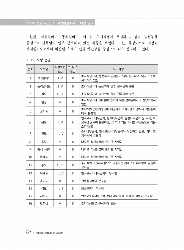 2015 전국 무인도서 자연환경조사 태안 권역 224 ? National Institute of Ecology 한편, 서격렬비도, 동격렬비도, 석도는 초지식생이 우점하고, 섬의 능선부를 중심으로 관목림이 일부 분포하고 있는 경향을 보인다. 또한, 특정도서로 지정된 북격렬비도로부터 비산된 유채가 산록 하단부를 중심으로 다수 분포하고 있다. 번호 도서명 식생보전 등급 보전가치 등급 특이사항 1 서격렬비도 Ⅲ,Ⅴ Ⅲ 초지식생이며, 능선부에 관목림이 일부 분포하며, 대규모 조류 서식지가 있음 2 동격렬비도 Ⅲ,Ⅴ Ⅲ 초지식생이며 능선부에 일부 관목림이 분포 3 석도 Ⅲ, Ⅴ Ⅲ 초지식생이며 능선부에 일부 관목림이 분포 4 알섬 Ⅴ Ⅲ 초지식생이나 식피율이 현저히 낮음 괭이갈매기의 집단서식지 영향 5 궁시도 Ⅴ Ⅲ ...