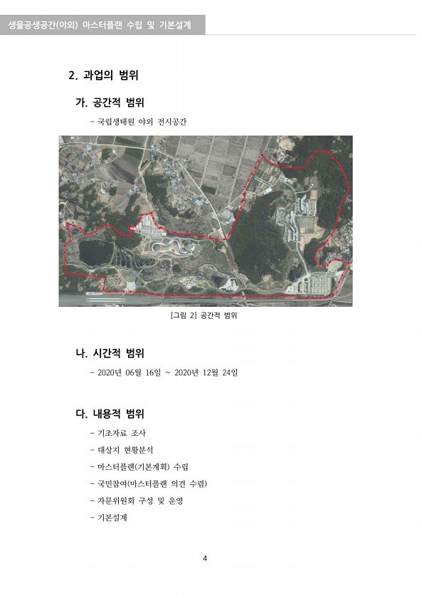 생물공생공간 야외 마스터플랜 수립 및 기본설계 4 2. 과업의 범위 가. 공간적 범위 국립생태원 야외 전시공간 [그림 2] 공간적 범위 나. 시간적 범위 2020년 06월 16일 2020년 12월 24일 다. 내용적 범위 기초자료 조사 대상지 현황분석 마스터플랜 기본계획 수립 국민참여 마스터플랜 의견 수렴 자문위원회 구성 및 운영기본설계