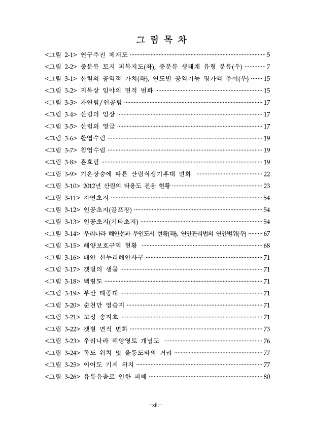 -xiii- 그 림 목 차 그림 연구추진 체계도 그림 중분류 토지 피복지도 좌 중분류 생태계 유형 분류 우 그림 산림의 공익적 가치 좌 연도별 공익기능 평가액 추이 우 그림 지목상 임야의 면적 변화 그림 자연림 인공림 그림 산림의 임상 그림 산림의 영급 그림 활엽수림 그림 침엽수림 그림 혼효림 그림 기온상승에 따른 산림식생기후대 변화 그림 년 산림의 타용도 전용 현황 그림 자연초지 그림 인공초지 골프장 그림 인공초지 기타초지 그림 우리나라 해안선과 무인도서 현황 좌 연안관리법의 연안범위 우 그림 해양보호구역 현황 그림 태안 신두리해안사구 그림 갯벌의 생물 그림 백령도 그림 부산 태종대 그림 순천만 염습지 그림 고성 송지호 그림 갯벌 면적 변화 그림 우리나라 해양영토 개념도 그림 독도 위치 및 울릉도와의 거리...