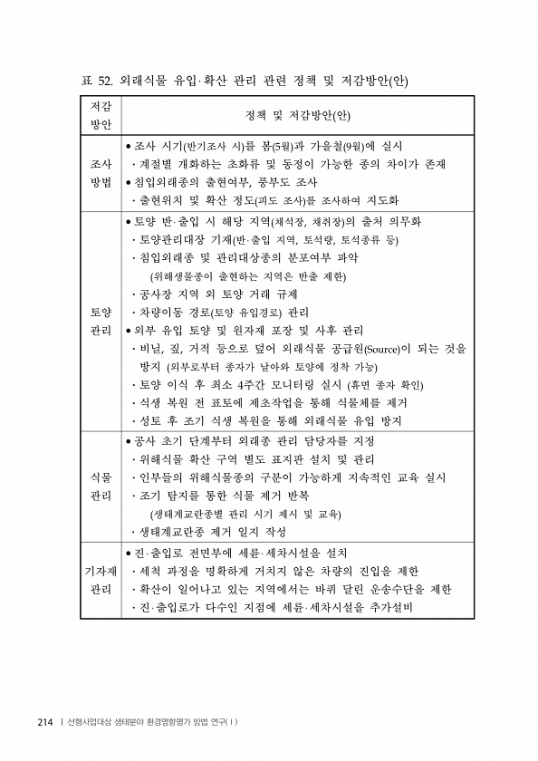 저감 방안 정책 및 저감방안 안 조사 방법 조사 시기 반기조사 시 를 봄 월 과 가을철 월 에 실시 계절별 개화하는 초화류 및 동정이 가능한 종의 차이가 존재 침입외래종의 출현여부 풍부도 조사 출현위치 및 확산 정도 피도 조사 를 조사하여 지도화 토양 관리 토양 반 출입 시 해당 지역 채석장 채취장 의 출처 의무화 토양관리대장 기재 반 출입 지역 토석량 토석종류 등 침입외래종 및 관리대상종의 분포여부 파악 위해생물종이 출현하는 지역은 반출 제한 공사장 지역 외 토양 거래 규제 차량이동 경로 토양 유입경로 관리 외부 유입 토양 및 원자재 포장 및 사후 관리 비닐 짚 거적 등으로 덮어 외래식물 공급원 이 되는 것을 방지 외부로부터 종자가 날아와 토양에 정착 가능 토양 이식 후 최소 주간 모니터링 실시 휴면 종자...