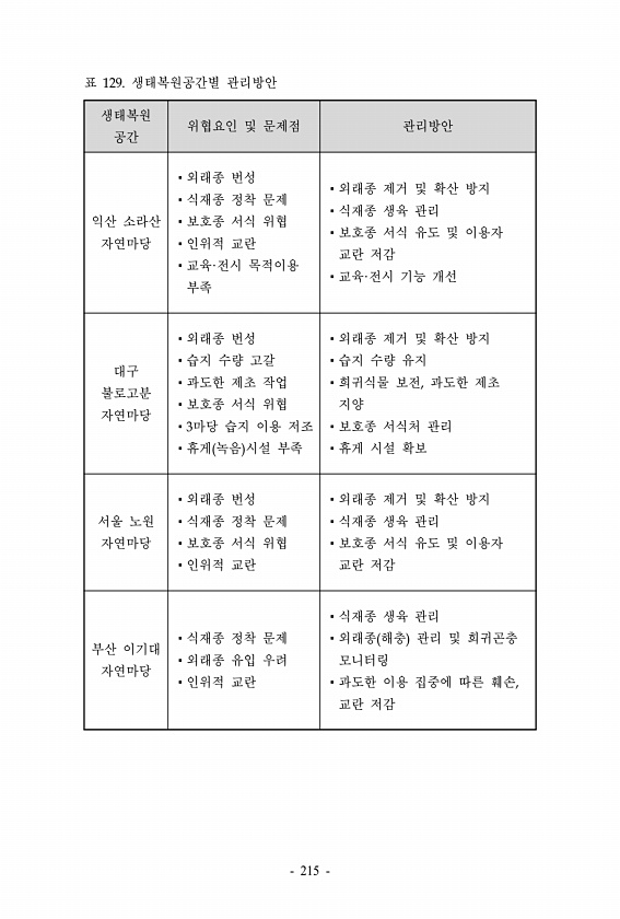 생태복원 공간 위협요인 및 문제점 관리방안 익산 소라산 자연마당 ?외래종 번성 ?식재종 정착 문제 ?보호종 서식 위협 ?인위적 교란 ?교육·전시 목적이용 부족 ?외래종 제거 및 확산 방지 ?식재종 생육 관리 ?보호종 서식 유도 및 이용자 교란 저감 ?교육·전시 기능 개선 대구 불로고분 자연마당 ?외래종 번성 ?습지 수량 고갈 ?과도한 제초 작업 ?보호종 서식 위협 ?3마당 습지 이용 저조 ?휴게 녹음 시설 부족 ?외래종 제거 및 확산 방지 ?습지 수량 유지 ?희귀식물 보전, 과도한 제초 지양 ?보호종 서식처 관리 ?휴게 시설 확보 서울 노원 자연마당 ?외래종 번성 ?식재종 정착 문제 ?보호종 서식 위협 ?인위적 교란 ?외래종 제거 및 확산 방지 ?식재종 생육 관리 ?보호종 서식 유도 및 이용자 교란 저감 부...