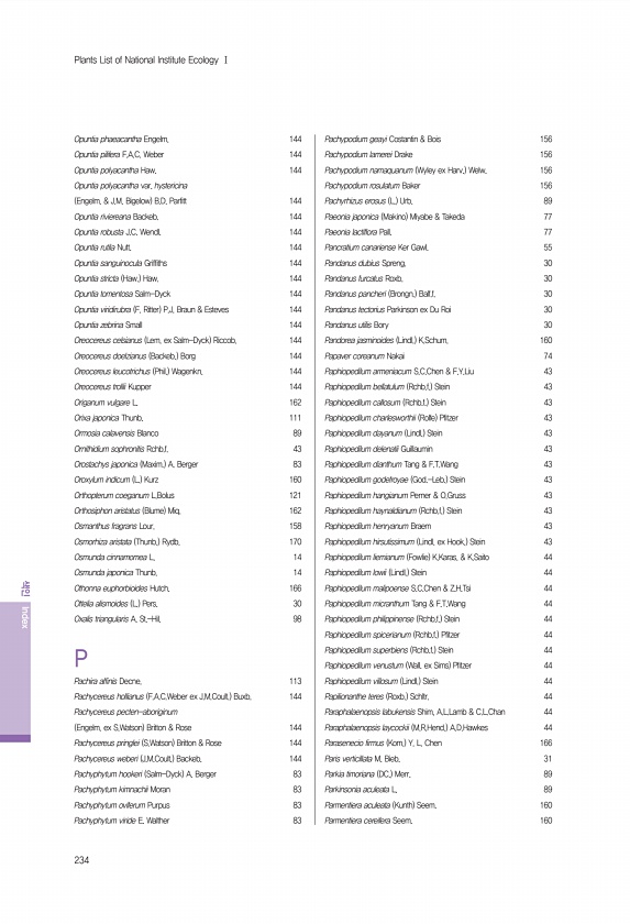234 색인 Index Plants List of National Institute Ecology Ⅰ Opuntia phaeacantha Engelm. 144 Opuntia pilifera F.A.C. Weber 144 Opuntia polyacantha Haw. 144 Opuntia polyacantha var. hystericina Engelm. & J.M. Bigelow B.D. Parfitt 144 Opuntia riviereana Backeb. 144 Opuntia robusta J.C. Wendl. 144 Opuntia rutila Nutt. 144 Opuntia sanguinocula Griffiths 144 Opuntia stricta Haw. Haw. 144 Opuntia tomentosa ...