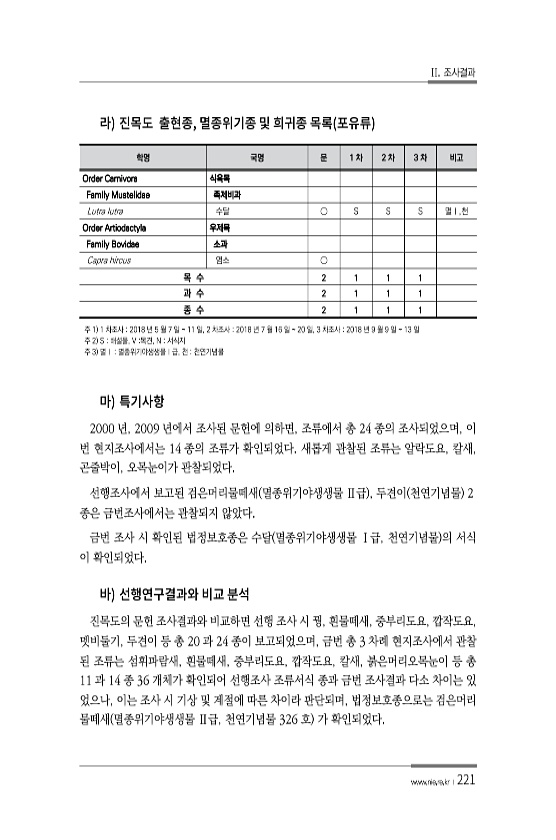 II. 조사결과 www.nie.re.kr ?221 , 2000 년, 2009 년에서 조사된 문헌에 의하면, 조류에서 총 24 종의 조사되었으며, 이 번 현지조사에서는 14 종의 조류가 확인되었다. 새롭게 관찰된 조류는 알락도요, 칼새, 곤줄박이, 오목눈이가 관찰되었다. 선행조사에서 보고된 검은머리물떼새 멸종위기야생생물 Ⅱ급 , 두견이 천연기념물 2 종은 금번조사에서는 관찰되지 않았다. 금번 조사 시 확인된 법정보호종은 수달 멸종위기야생생물 Ⅰ급, 천연기념물 의 서식 이 확인되었다. 진목도의 문헌 조사결과와 비교하면 선행 조사 시 꿩, 흰물떼새, 중부리도요, 깝작도요, 멧비둘기, 두견이 등 총 20 과 24 종이 보고되었으며, 금번 총 3 차례 현지조사에서 관찰 된 조류는 섬휘파람새, 흰물떼새, 중부리도요, ...