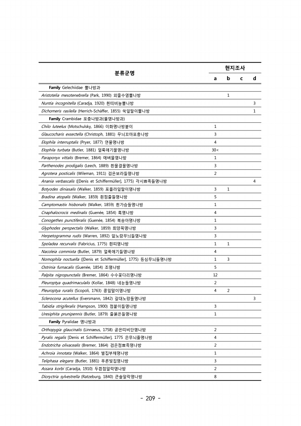 209 분류군명 현지조사 a b c d Family Gelechiidae 뿔나방과 Aristotelia mesotenebrella Park, 1990 외줄수염뿔나방 1 Nuntia incognitella Caradja, 1920 흰띠비늘뿔나방 3 Dichomeris rasilella Herrich-Sch?ffer, 1855 쑥잎말이뿔나방 1 Family Crambidae 포충나방과 풀명나방과 Chilo luteelus Motschulsky, 1866 이화명나방붙이 1 Glaucocharis exsectella Christoph, 1881 무늬꼬마포충나방 3 Elophila interruptalis Pryer, 1877 연물명나방 4 Elophila turba...
