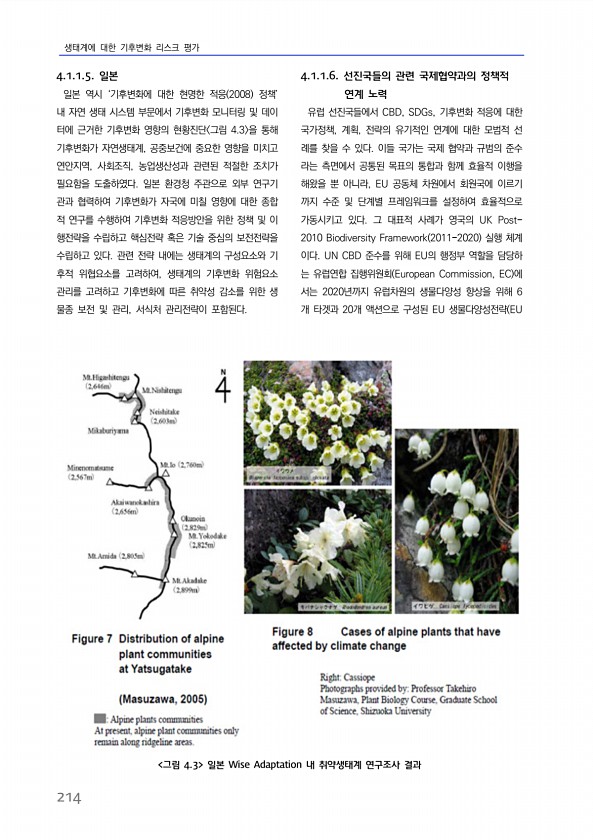 생태계에 대한 기후변화 리스크 평가 214 4.1.1.5. 일본 일본 역시 ‘기후변화에 대한 현명한 적응 2008 정책’ 내 자연 생태 시스템 부문에서 기후변화 모니터링 및 데이 터에 근거한 기후변화 영향의 현황진단 그림 4.3 을 통해 기후변화가 자연생태계, 공중보건에 중요한 영향을 미치고 연안지역, 사회조직, 농업생산성과 관련된 적절한 조치가 필요함을 도출하였다. 일본 환경청 주관으로 외부 연구기 관과 협력하여 기후변화가 자국에 미칠 영향에 대한 종합 적 연구를 수행하여 기후변화 적응방안을 위한 정책 및 이 행전략을 수립하고 핵심전략 혹은 기술 중심의 보전전략을 수립하고 있다. 관련 전략 내에는 생태계의 구성요소와 기 후적 위협요소를 고려하여, 생태계의 기후변화 위험요소 관리를 고려하고 기후변화에 따른 ...