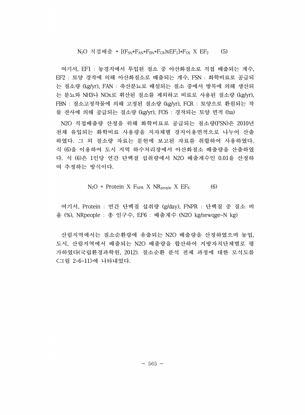 565 N2O 직접배출 = [ FSN+FAN+FBN+FCR xEF1]+FOS X EF2 5 여기서, EF1 농경지에서 투입된 질소 중 아산화질소로 직접 배출되는 계수, EF2 토양 경작에 의해 아산화질소로 배출되는 계수, FSN 화학비료로 공급되 는 질소량 kg/yr , FAN 축산분뇨로 배설되는 질소 중에서 방목에 의해 생산되 는 분뇨와 NH3나 NOx로 휘산된 질소를 제외하고 비료로 사용된 질소량 kg/yr , FBN 질소고정작물에 의해 고정된 질소량 kg/yr , FCR 토양으로 환원되는 작 물 잔사에 의해 공급되는 질소량 kg/yr , FOS 경작되는 토양 면적 ha N2O 직접배출량 산정을 위해 화학비료로 공급되는 질소량 FSN 은 2010년 전체 유입되는 화학비료 사용량을 지자체별 경지이용면적으로...