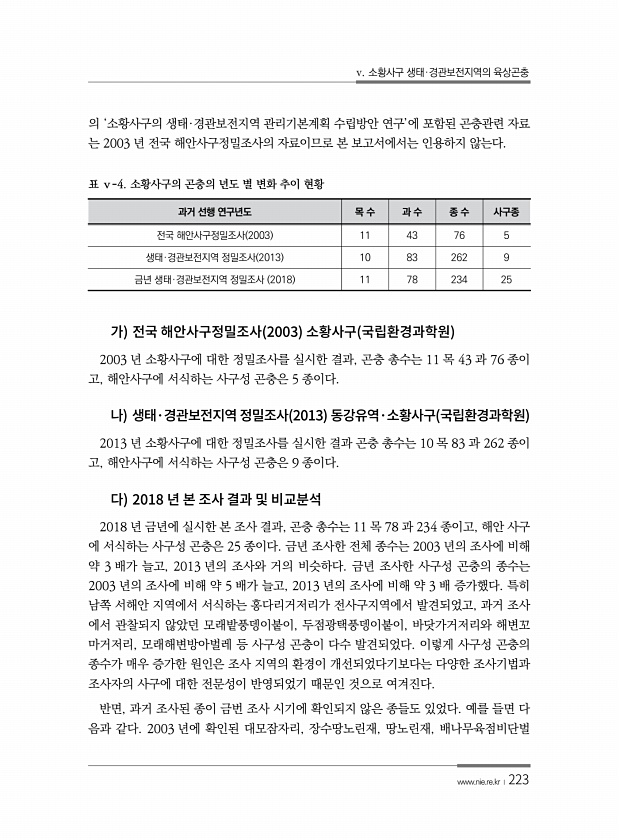 v. 소황사구 생태·경관보전지역의 육상곤충 www.nie.re.kr ?223 의 ‘소황사구의 생태·경관보전지역 관리기본계획 수립방안 연구’에 포함된 곤충관련 자료 는 2003 년 전국 해안사구정밀조사의 자료이므로 본 보고서에서는 인용하지 않는다. 과거 선행 연구년도 목 수 과 수 종 수 사구종 전국 해안사구정밀조사 2003 11 43 76 5 생태·경관보전지역 정밀조사 2013 10 83 262 9 금년 생태·경관보전지역 정밀조사 2018 11 78 234 25 표 ⅴ-4. 소황사구의 곤충의 년도 별 변화 추이 현황 2003 2003 년 소황사구에 대한 정밀조사를 실시한 결과, 곤충 총수는 11 목 43 과 76 종이 고, 해안사구에 서식하는 사구성 곤충은 5 종이다. 2013 · 2013 년 소황사구에 대...