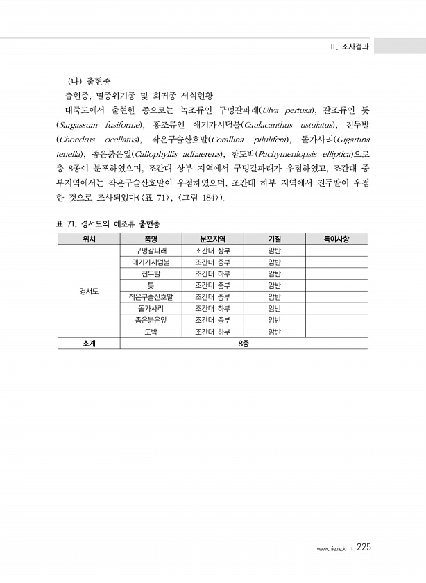 Ⅱ. 조사결과 www.nie.re.kr ? 225 나 출현종 출현종, 멸종위기종 및 희귀종 서식현황 대죽도에서 출현한 종으로는 녹조류인 구멍갈파래 Ulva pertusa , 갈조류인 톳 Sargassum fusiforme , 홍조류인 애기가시덤불 Caulacanthus ustulatus , 진두발 Chondrus ocellatus , 작은구슬산호말 Corallina pilulifera , 돌가사리 Gigartina tenella , 좁은붉은잎 Callophyllis adhaerens , 참도박 Pachymeniopsis elliptica 으로 총 8종이 분포하였으며, 조간대 상부 지역에서 구멍갈파래가 우점하였고, 조간대 중 부지역에서는 작은구슬산호말이 우점하였으며, 조간대 하부 지역에서 진두발이 우점 한 것...