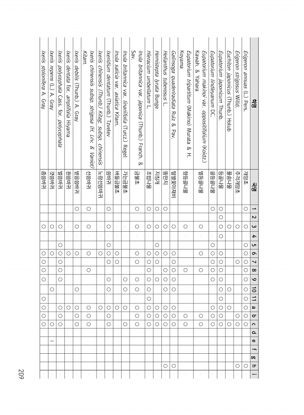 209 학명 국명 1 2 3 4 5 6 7 8 9 10 11 a b c d e f g h i Erigeron annuas L. Pers. 개망초 ○ ○ ○ ○ ○ ○ ○ ○ ○ ○ ○ ○ ○ Erigeron strigosus Willd. 주걱개망초 ○ ○ ○ ○ ○ Euchiton japonicus Thunb. Holub 풀솜나물 ○ ○ ○ ○ Eupatorium japonicum Thunb. 등골나물 ○ ○ ○ ○ ○ ○ ○ ○ ○ ○ ○ ○ ○ Eupatorium lindleyanum DC. 골등골나물 ○ ○ ○ ○ ○ ○ ○ ○ ○ Eupatorium makinoi var. oppositifolium Koidz. Kawah. & Yahara 벌등골나물 ○ ○ ○ ○ ○ Eupatorium tripart...