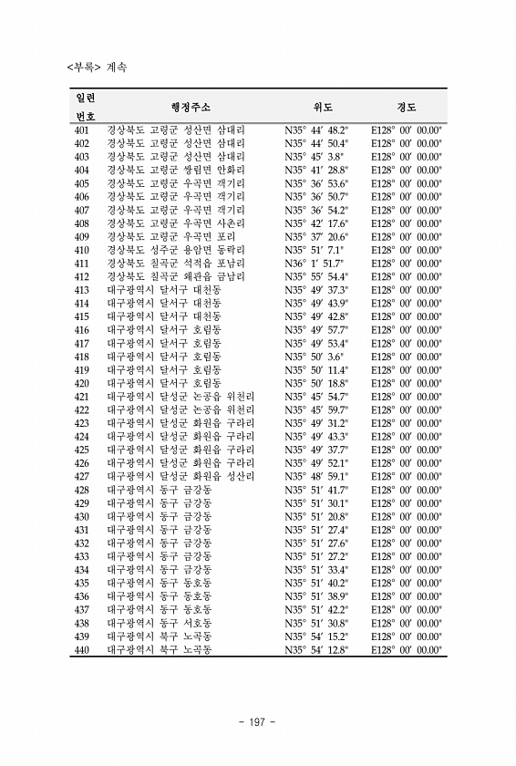 부록 계속 일련 번호 행정주소 위도 경도 401 경상북도 고령군 성산면 삼대리 N35° 4448.2E128° 0000.00402 경상북도 고령군 성산면 삼대리 N35° 4450.4E128° 0000.00403 경상북도 고령군 성산면 삼대리 N35° 453.8E128° 0000.00404 경상북도 고령군 쌍림면 안화리 N35° 4128.8E128° 0000.00405 경상북도 고령군 우곡면 객기리 N35° 3653.6E128° 0000.00406 경상북도 고령군 우곡면 객기리 N35° 3650.7E128° 0000.00407 경상북도 고령군 우곡면 객기리 N35° 3654.2E128° 0000.00408 경상북도 고령군 우곡면 사촌리 N35° 4217.6E128° 0000.00409 경상북도 고령군 우곡면 포...