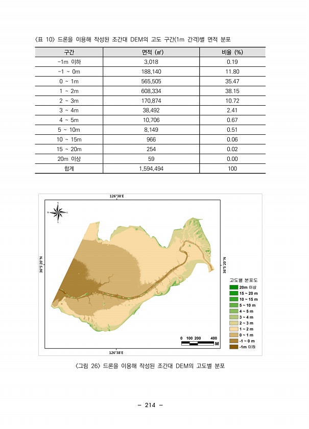 214 구간 면적 ㎡ 비율 % -1m 이하 3,018 0.19 -1 0m 188,140 11.80 0 1m 565,505 35.47 1 2m 608,334 38.15 2 3m 170,874 10.72 3 4m 38,492 2.41 4 5m 10,706 0.67 5 10m 8,149 0.51 10 15m 966 0.06 15 20m 254 0.02 20m 이상 59 0.00 합계 1,594,494 100 표 10 드론을 이용해 작성된 조간대 DEM의 고도 구간 1m 간격 별 면적 분포 그림 26 드론을 이용해 작성된 조간대 DEM의 고도별분포