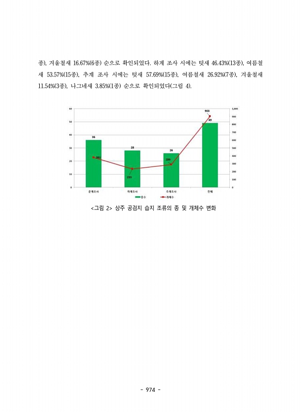 974 종 , 겨울철새 16.67% 6종 순으로 확인되었다. 하계 조사 시에는 텃새 46.43% 13종 , 여름철 새 53.57% 15종 , 추계 조사 시에는 텃새 57.69% 15종 , 여름철새 26.92% 7종 , 겨울철새 11.54% 3종 , 나그네새 3.85% 1종 순으로 확인되었다 그림 4 그림 2 상주 공검지 습지 조류의 종 및 개체수변화