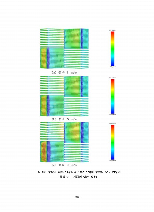 그림 133. 풍속에 따른 인공환경조절시스템의 풍압력 분포 컨투어 풍향 0°, 관중이 없는 경우 202