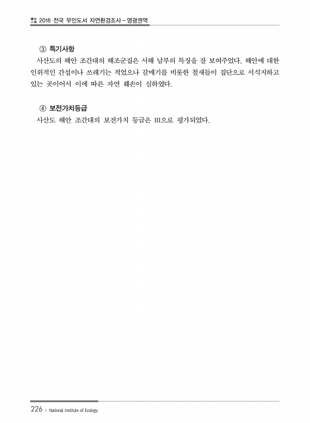 2016 전국 무인도서 자연환경조사 영광권역 226 ? National Institute of Ecology ③ 특기사항 사산도의 해안 조간대의 해조군집은 서해 남부의 특징을 잘 보여주었다. 해안에 대한 인위적인 간섭이나 쓰레기는 적었으나 갈매기를 비롯한 철새들이 집단으로 서식지하고 있는 곳이어서 이에 따른 자연 훼손이 심하였다. ④ 보전가치등급 사산도 해안 조간대의 보전가치 등급은 III으로평가되었다.