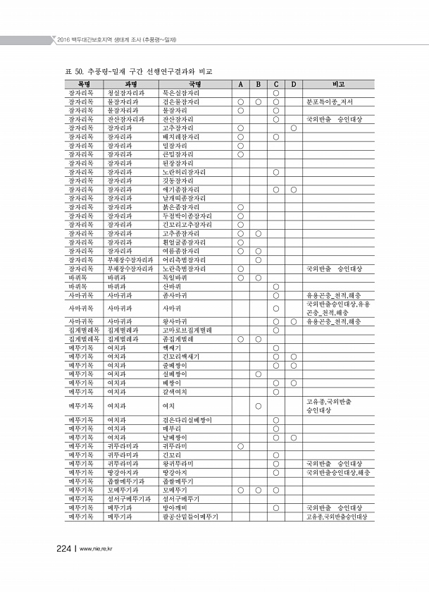 2016 백두대간보호지역 생태계 조사 추풍령밀재 224Ⅰwww.nie.re.kr 목명 과명 국명 A B C D 비고 잠자리목 청실잠자리과 묵은실잠자리 ○ 잠자리목 물잠자리과 검은물잠자리 ○ ○ ○ 분포특이종_저서 잠자리목 물잠자리과 물잠자리 ○ ○ 잠자리목 잔산잠자리과 잔산잠자리 ○ 국외반출 승인대상 잠자리목 잠자리과 고추잠자리 ○ ○ 잠자리목 잠자리과 배치레잠자리 ○ ○ 잠자리목 잠자리과 밀잠자리 ○ 잠자리목 잠자리과 큰밀잠자리 ○ 잠자리목 잠자리과 된장잠자리 잠자리목 잠자리과 노란허리잠자리 ○ 잠자리목 잠자리과 깃동잠자리 잠자리목 잠자리과 애기좀잠자리 ○ ○ 잠자리목 잠자리과 날개띠좀잠자리 잠자리목 잠자리과 붉은좀잠자리 ○ 잠자리목 잠자리과 두점박이좀잠자리 ○ 잠자리목 잠자리과 긴꼬리고추잠자리 ○ 잠자리...