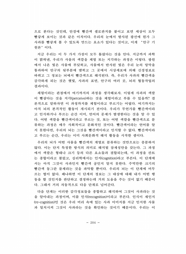 204 으로 본다는 것인데, 안경에 빨간색 셀로판지를 붙이고 보면 세상이 모두 빨갛게 보이는 것과 같은 이치이다. 우리의 눈에서 발사된 광선에 뭔가 그 사과를 빨갛게 볼 수 있도록 만드는 요소가 있다는 것이고, 이게 ‘안구 기 원론’이다. 지금 우리는 이 두 가지 가설이 모두 틀렸다는 것을 안다. 지금까지 과학 이 밝혀낸, 우리가 사물의 색깔을 체험 또는 지각하는 과정은 이렇다. 광원 에서 나온 빛은 사물에 부딪히고, 사물에서 반사된 빛은 우리 눈의 망막을 통과하여 안구의 뒷부분에 맺히고 그 곳에서 시상세포에 의해 신경정보로 바뀌고 그 정보는 뇌에서 빨간색으로 해석된다. 즉, 우리가 사과의 빨간색을 감각하게 되는 것은 햇빛, 사과의 표면, 안구의 여러 곳, 뇌의 협동작업의 결과이다. 체험이라는 관점에서 여기...