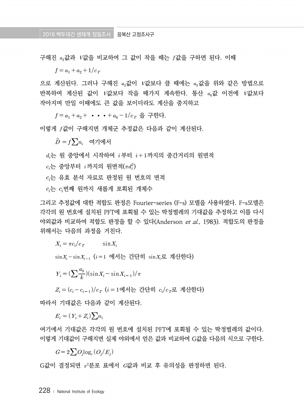 2018 백두대간 생태계 정밀조사 응복산 고정조사구 228 ? National Institute of Ecology 구해진 ?값과 값을 비교하여 그 값이 작을 때는 ?값을 구하면 된다. 이때 ? ? ? ? 으로 계산된다. 그러나 구해진 ?값이 값보다 클 때에는 ?값을 위와 같은 방법으로 반복하여 계산된 값이 값보다 작을 때가지 계속한다. 통산 ?값 이전에 값보다 작아지며 만일 이때에도 큰 값을 보이더라도 계산을 중지하고 ? ? ? ??? ? ? 을 구한다. 이렇게 ?값이 구해지면 개체군 추정값은 다음과 같이 계산된다. ??? 여기에서 ? ?는 원 중앙에서 시작하여 ? 부터 ? 까지의 중간거리의 원면적 ??는 중앙부터 ?까지의 원면적...