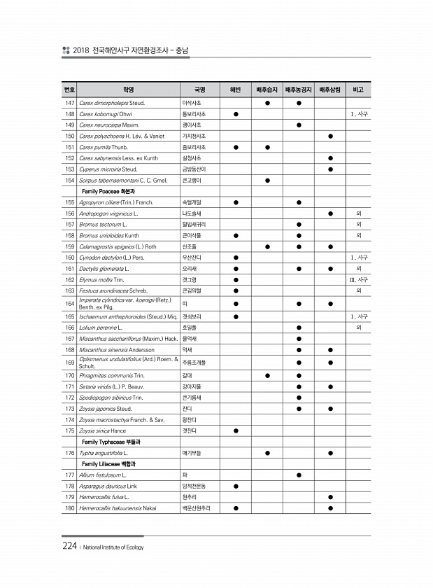 2018 전국해안사구 자연환경조사 충남 224 ? National Institute of Ecology 번호 학명 국명 해빈 배후습지 배후농경지 배후삼림 비고 147 Carex dimorpholepis Steud. 이삭사초 ● ● 148 Carex kobomugi Ohwi 통보리사초 ● Ⅰ, 사구 149 Carex neurocarpa Maxim. 괭이사초 ● 150 Carex polyschoena H. Le?v. & Vaniot 가지청사초 ● 151 Carex pumila Thunb. 좀보리사초 ● ● 152 Carex sabynensis Less. ex Kunth 실청사초 ● 153 Cyperus microiria Steud. 금방동산이 ● 154 Scirpus tabernaemontani C. C. Gm...