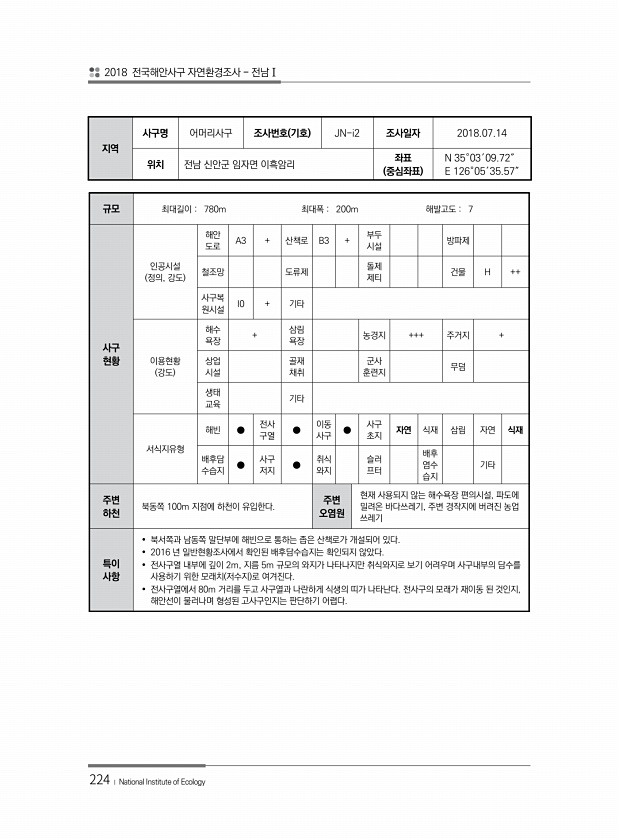 2018 전국해안사구 자연환경조사 전남Ⅰ 224 ? National Institute of Ecology 지역 사구명 어머리사구 조사번호 기호 JN-i2 조사일자 2018.07.14 위치 전남 신안군 임자면 이흑암리 좌표 중심좌표 N 35°03′09.72″ E 126°05′35.57″ 규모 최대길이 780m 최대폭 200m 해발고도 7 사구 현황 인공시설 정의, 강도 해안 도로 A3 + 산책로 B3 + 부두 시설 방파제 철조망 도류제 돌제 제티 건물 H ++ 사구복 원시설 I0 + 기타 이용현황 강도 해수 욕장 + 삼림 욕장 농경지 +++ 주거지 + 상업 시설 골재 채취 군사 훈련지 무덤 생태 교육 기타 서식지유형 해빈 ● 전사 구열 ● 이동 사구 ● 사구 초지 자연 식재 삼림 자연 식재 배후담 수습지 ● ...