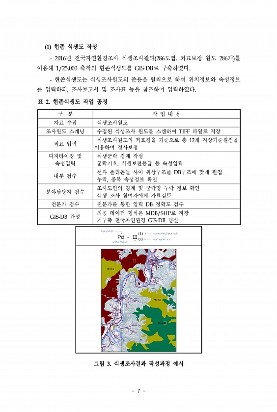 7 1 현존 식생도 작성 2016년 전국자연환경조사 식생조사결과 286도엽, 좌표보정 원도 286개 를 이용해 1/25,000 축척의 현존식생도를 GIS-DB로 구축하였다. 현존식생도는 식생조사원도의 준용을 원칙으로 하여 위치정보와 속성정보 를 입력하되, 조사보고서 및 조사표 등을 참조하여 입력하였다. 구 분 작 업 내 용 자료 수집 식생조사원도 조사원도 스캐닝 수집된 식생조사 원도를 스캔하여 TIFF 파일로 저장 좌표 입력 식생조사원도의 좌표점을 기준으로 총 12개 지상기준원점을 이용하여 정사보정 디지타이징 및 속성입력 식생군락 경계 작성 군락기호, 식생보전등급 등 속성입력 내부 검수 선과 폴리곤들 사이 위상구조를 DB구조에 맞게 편집 누락, 중복 속성정보 확인 분야담당자 검수 조사도면의 경계 및 군락명 ...