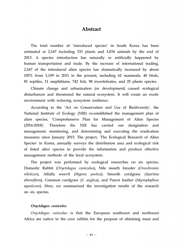 xv Abstract The total number of ‘introduced species’ in South Korea has been estimated at 2,167 including 333 plants and 1,834 animals by the end of 2013. A species introduction has naturally or artificially happened by human transportation and trade. By the increase of international trading, 2,167 of the introduced alien species has dramatically increased by about 105% from 1,109 in 2011 to the p...