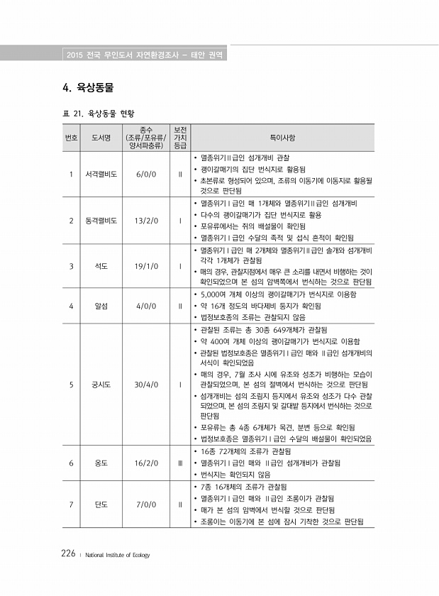 2015 전국 무인도서 자연환경조사 태안 권역 226 ? National Institute of Ecology 번호 도서명 종수 조류/포유류/ 양서파충류 보전 가치 등급 특이사항 1 서격렬비도 6/0/0 Ⅱ ? 멸종위기Ⅱ급인 섬개개비 관찰 ? 괭이갈매기의 집단 번식지로 활용됨 ? 초본류로 형성되어 있으며, 조류의 이동기에 이동지로 활용될 것으로 판단됨 2 동격렬비도 13/2/0 Ⅰ ? 멸종위기Ⅰ급인 매 1개체와 멸종위기Ⅱ급인 섬개개비 ? 다수의 괭이갈매기가 집단 번식지로 활용 ? 포유류에서는 쥐의 배설물이 확인됨 ? 멸종위기Ⅰ급인 수달의 족적 및 섭식 흔적이 확인됨 3 석도 19/1/0 Ⅰ ? 멸종위기Ⅰ급인 매 2개체와 멸종위기Ⅱ급인 솔개와 섬개개비 각각 1개체가 관찰됨 ? 매의 경우, 관찰지점에서 매우 큰...
