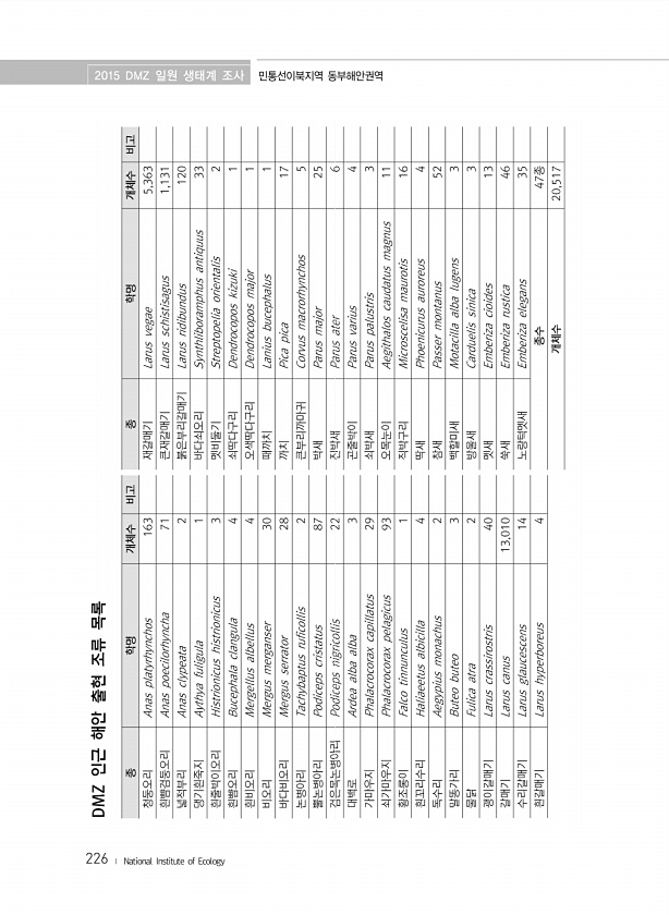 2015 DMZ 일원 생태계 조사 민통선이북지역 동부해안권역 226 ? National Institute ofEcology