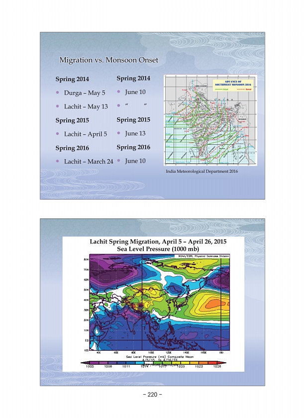 Lachit Spring Migration, April 5 ? April 26, 2015 Sea Level Pressure 1000 mb Migration vs. Monsoon Onset Spring 2014 ? Durga ? May 5 ? Lachit ? May 13 Spring 2015 ? Lachit ? April 5 Spring 2016 ? Lachit ? March 24 Spring 2014 ? June 10 ? “ “ Spring 2015 ? June 13 Spring 2016 ? June 10 India Meteorological Department 2016 220