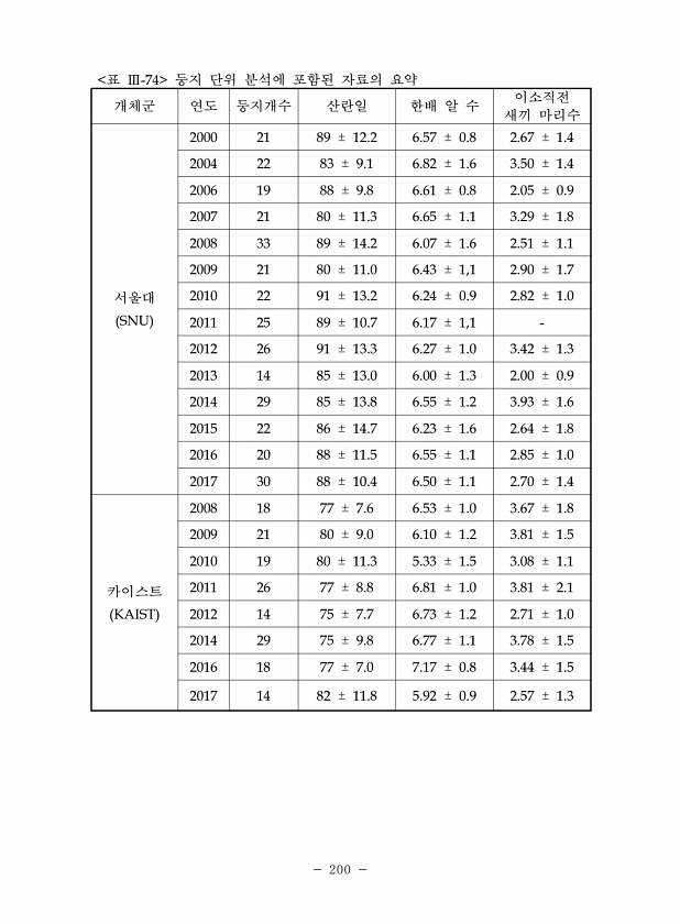 200 표 Ⅲ-74 둥지 단위 분석에 포함된 자료의 요약 개체군 연도 둥지개수 산란일 한배 알 수 이소직전 새끼 마리수 서울대 SNU 2000 21 89 ± 12.2 6.57 ± 0.8 2.67 ± 1.4 2004 22 83 ± 9.1 6.82 ± 1.6 3.50 ± 1.4 2006 19 88 ± 9.8 6.61 ± 0.8 2.05 ± 0.9 2007 21 80 ± 11.3 6.65 ± 1.1 3.29 ± 1.8 2008 33 89 ± 14.2 6.07 ± 1.6 2.51 ± 1.1 2009 21 80 ± 11.0 6.43 ± 1,1 2.90 ± 1.7 2010 22 91 ± 13.2 6.24 ± 0.9 2.82 ± 1.0 2011 25 89 ± 10.7 6.17 ± 1,1 2012 26 91 ± 13.3 ...