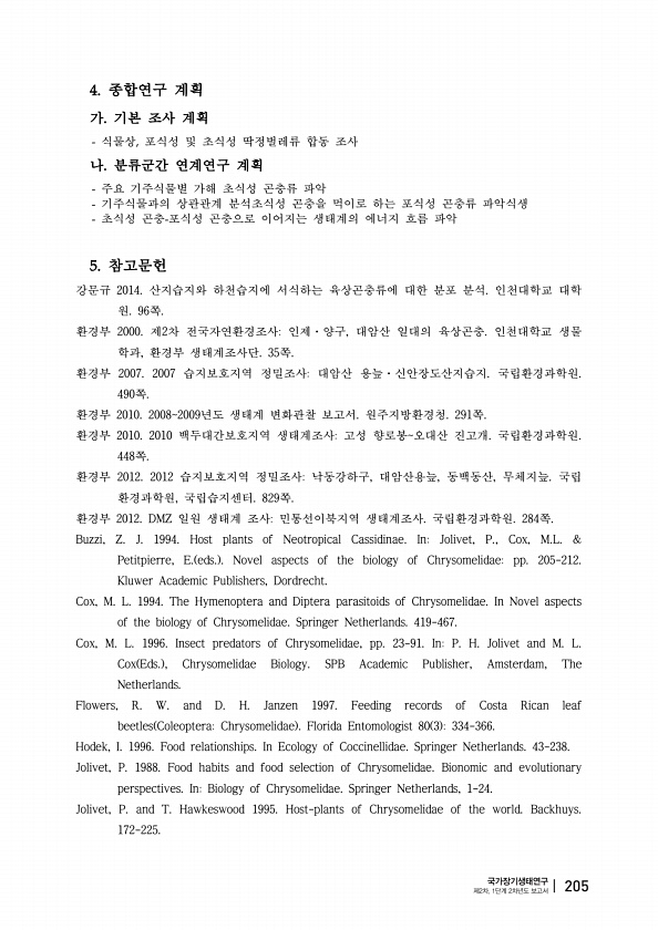 종합연구 계획 가 기본 조사 계획 식물상 포식성 및 초식성 딱정벌레류 합동 조사 나 분류군간 연계연구 계획 주요 기주식물별 가해 초식성 곤충류 파악 기주식물과의 상관관계 분석초식성 곤충을 먹이로 하는 포식성 곤충류 파악식생 초식성 곤충 포식성 곤충으로 이어지는 생태계의 에너지 흐름 파악 참고문헌 강문규 2014. 산지습지와 하천습지에 서식하는 육상곤충류에 대한 분포 분석. 인천대학교 대학 원. 96쪽. 환경부 2000. 제2차 전국자연환경조사인제·양구, 대암산 일대의 육상곤충. 인천대학교 생물 학과, 환경부 생태계조사단. 35쪽. 환경부 2007. 2007 습지보호지역 정밀조사대암산 용늪·신안장도산지습지. 국립환경과학원. 490쪽. 환경부 2010. 20082009년도 생태계 변화관찰 보고서. 원주지방환경청...