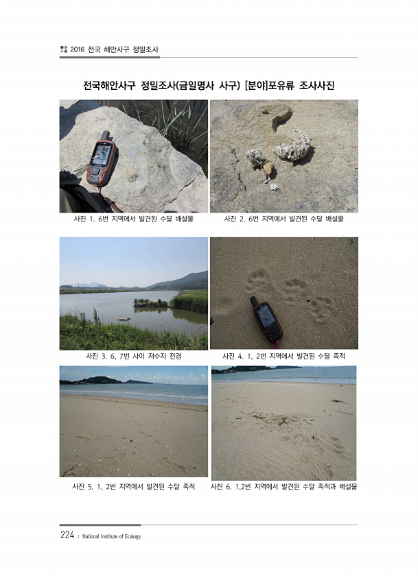2016 전국 해안사구 정밀조사 224 ? National Institute of Ecology 전국해안사구 정밀조사 금일명사 사구 [분야]포유류 조사사진 사진 1. 6번 지역에서 발견된 수달 배설물 사진 2. 6번 지역에서 발견된 수달 배설물 사진 3. 6, 7번 사이 저수지 전경 사진 4. 1, 2번 지역에서 발견된 수달 족적 사진 5. 1, 2번 지역에서 발견된 수달 족적 사진 6. 1,2번 지역에서 발견된 수달 족적과배설물