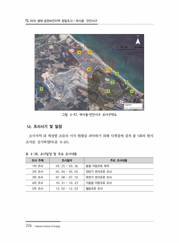 2016 생태·경관보전지역 정밀조사 하시동 · 안인사구 224 ? National Institute of Ecology 그림 Ⅱ-57. 하시동·안인사구 조사구역도 나. 조사시기 및 일정 조사지역 내 계절별 조류의 서식 현황을 파악하기 위해 사계절에 걸쳐 총 5회의 현지 조사를 실시하였다 표 Ⅱ-26 표 Ⅱ-26. 조사일정 및 주요 조사내용 조사 주제 조사일자 주요 조사내용 1차 조사 03. 25 ? 03. 26 봄철 이동조류 파악 2차 조사 05. 04 ? 05. 05 전반기 번식조류 조사 3차 조사 07. 08 ? 07. 10 후반기 번식조류 조사 4차 조사 10. 21 ? 10. 23 가을철 이동조류 조사 5차 조사 12. 02 ? 12. 03 월동조류조사