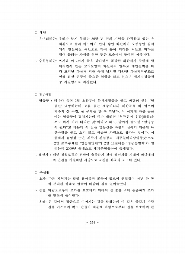 224 해안 용머리해안 우리가 알지 못하는 만 년 전의 기억을 간직하고 있는 응 회환으로 물과 마그마가 만나 쌓인 화산재가 오랫동안 침식 되어 만들어진 해안으로 마치 용이 머리를 쳐들고 바다로 뛰어 들려는 자세를 취한 듯한 모습에서 붙여진 이름이다 수월봉해안 뜨거운 마그마가 물을 만나면서 폭발한 화산재가 주변에 떨 어지면서 만든 고리모양의 화산체의 일부로 해안절벽을 따 라 드러난 화산재 지층 속에 남겨진 다양한 화산퇴적구조로 인해 화산 연구에 중요한 역할을 하고 있으며 세계지질공원 중 지질명소로 지정됐다 당 사당 영등굿 해마다 음력 월 초하루에 북서계절풍을 몰고 바람의 신인 영 등신 내방하는데 보름 동안 제주바다의 해산물을 따 먹으며 제주의 산 구경 물 구경을 한 후 떠난다 이 시기에 마을 곳곳 에는 영등굿...