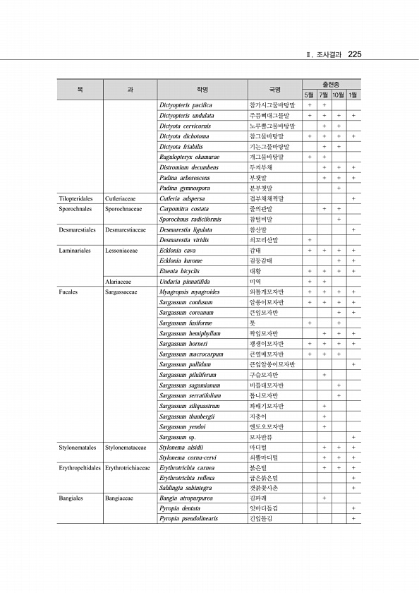 Ⅱ. 조사결과 225 목 과 학명 국명 출현종 5월 7월 10월 1월 Dictyopteris pacifica 참가시그물바탕말 + + Dictyopteris undulata 주름뼈대그물말 + + + + Dictyota cervicornis 노루뿔그물바탕말 + + Dictyota dichotoma 참그물바탕말 + + + + Dictyota friabilis 기는그물바탕말 + + Rugulopteryx okamurae 개그물바탕말 + + Distromium decumbens 두켜부채 + + + Padina arborescens 부챗말 + + + Padina gymnospora 분부챗말 + Tilopteridales Cutleriaceae Cutleria adspersa 겹부채채찍말 ...