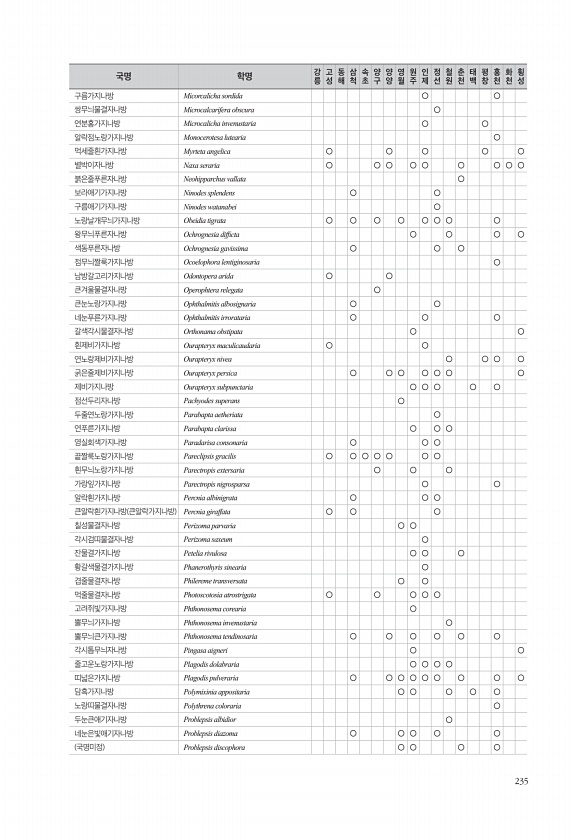 235 구름가지나방 Micorcalicha sordida ○ ○ 쌍무늬물결자나방 Microcalcarifera obscura ○ 연분홍가지나방 Microcalicha invenustaria ○ ○ 알락점노랑가지나방 Monocerotesa lutearia ○ 먹세줄흰가지나방 Myrteta angelica ○ ○ ○ ○ ○ 별박이자나방 Naxa seraria ○ ○ ○ ○ ○ ○ ○ ○ ○ 붉은줄푸른자나방 Neohipparchus vallata ○ 보라애기가지나방 Ninodes splendens ○ ○ 구름애기가지나방 Ninodes watanabei ○ 노랑날개무늬가지나방 Obeidia tigrata ○ ○ ○ ○ ○ ○ ○ ○ 왕무늬푸른자나방 Ochrognesia diffcta ○ ○ ○ ○ 색동푸른자나방 O...